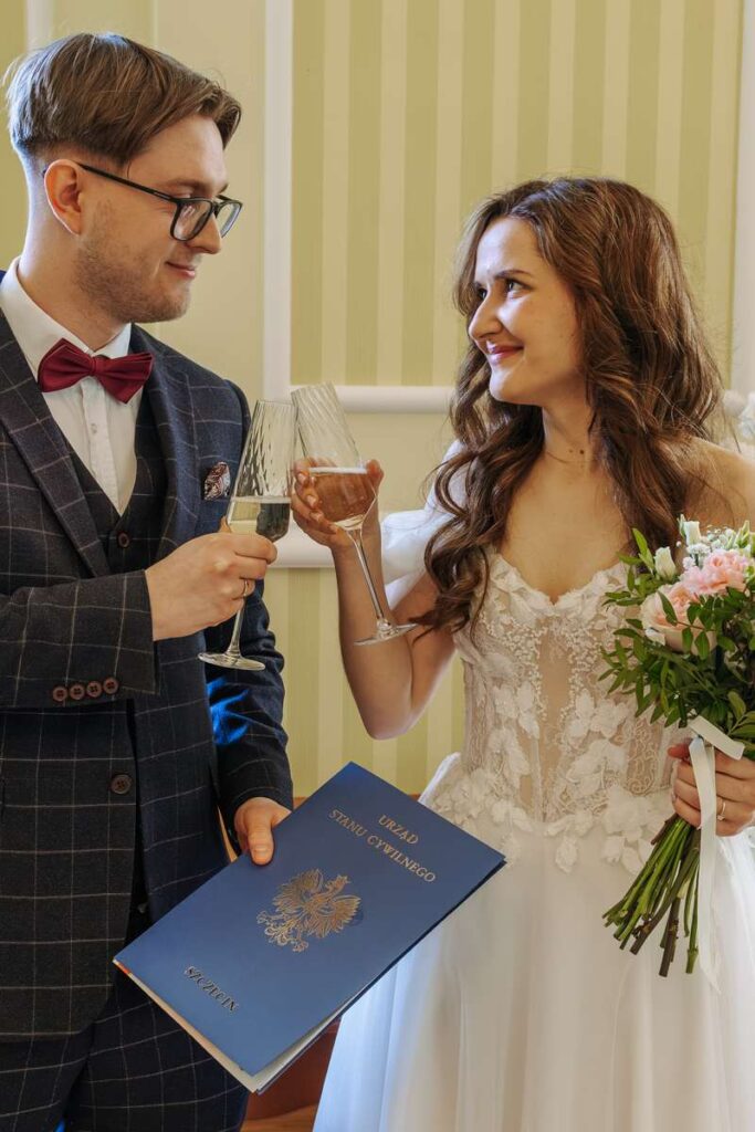 Wariant kilkugodzinny najlepiej sprawdza się przy ślubach kameralnych. Jeśli planujecie samą ceremonię, obiad z rodziną, kilka zdjęć z bliskimi i może krótki spacer po uroczystości, to nie ma sensu zamawiać pełnego reportażu od rana do nocy tylko dlatego, że tak robi wiele par. Krótsza obecność fotografa daje to, co najważniejsze: zdjęcia z przysięgi, emocje tuż po ślubie, portrety z rodziną i kilka wspólnych ujęć już jako mąż i żona. Dla wielu osób to w zupełności wystarcza i nie ma w tym niczego „gorszego”.